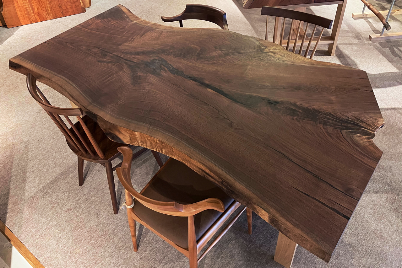 個性的な形と縮み杢が入ったブラックウォルナットの一枚板は、お部屋のシンボルとなり、自然とご家族やお友達がこのテーブルに集まってくるような存在感があります。