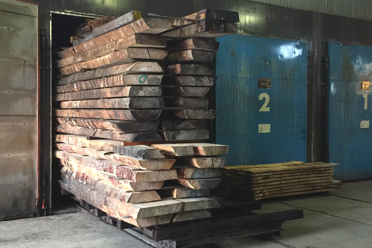 自然の風と時間の力を借りて、木がゆっくりと水分を手放していく工程です。ただし、10年以上天然乾燥された一枚板であっても、現代の住まい環境では反ってしまうことがあります。